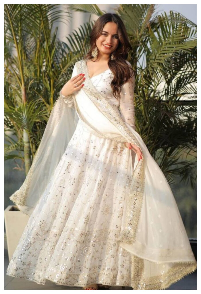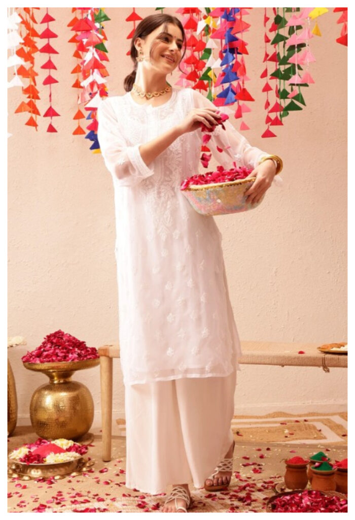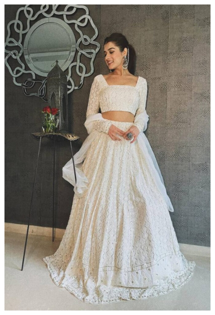 Next on our list of Cloud Dancer white outfit ideas is this elegant georgette lehenga choli from Mirraw. Featuring a stylish square neckline and full sleeves, the choli exudes charm. The skirt is flared and pretty. Further, the outfit has stylish Chikankari embroidery all over it, enhancing its charm even further. The top pick for festivals and parties, this lehenga has truly mesmerized us.