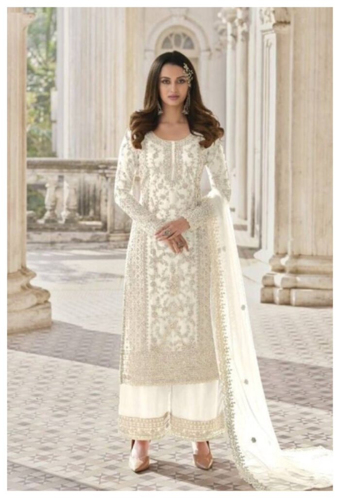 Few outfits celebrate the Cloud Dancer white trend like the salwar kameez. Shop for this stunning embroidered salwar kameez from Mirraw and upgrade your style quotient with ease. It is full-sleeved and has a soft V-neckline. The soft, cloud-like color is juxtaposed with graceful silver embroidery, creating a vivid effect that speaks of elegance and minimalism.