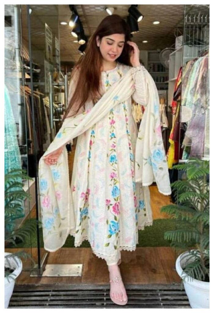 If you are looking to incorporate the Cloud Dancer white trend in your daily wardrobe, choosing a kurti pant set in this hue is the perfect option. Take Mirraw’s cotton kurti pant set, for example. It is crafted to ensure you remain stylish while running daily errands or at the office. Its pristine Cloud Dancer white fabric is the perfect base for the turquoise and blue floral prints – making them pop like no other.