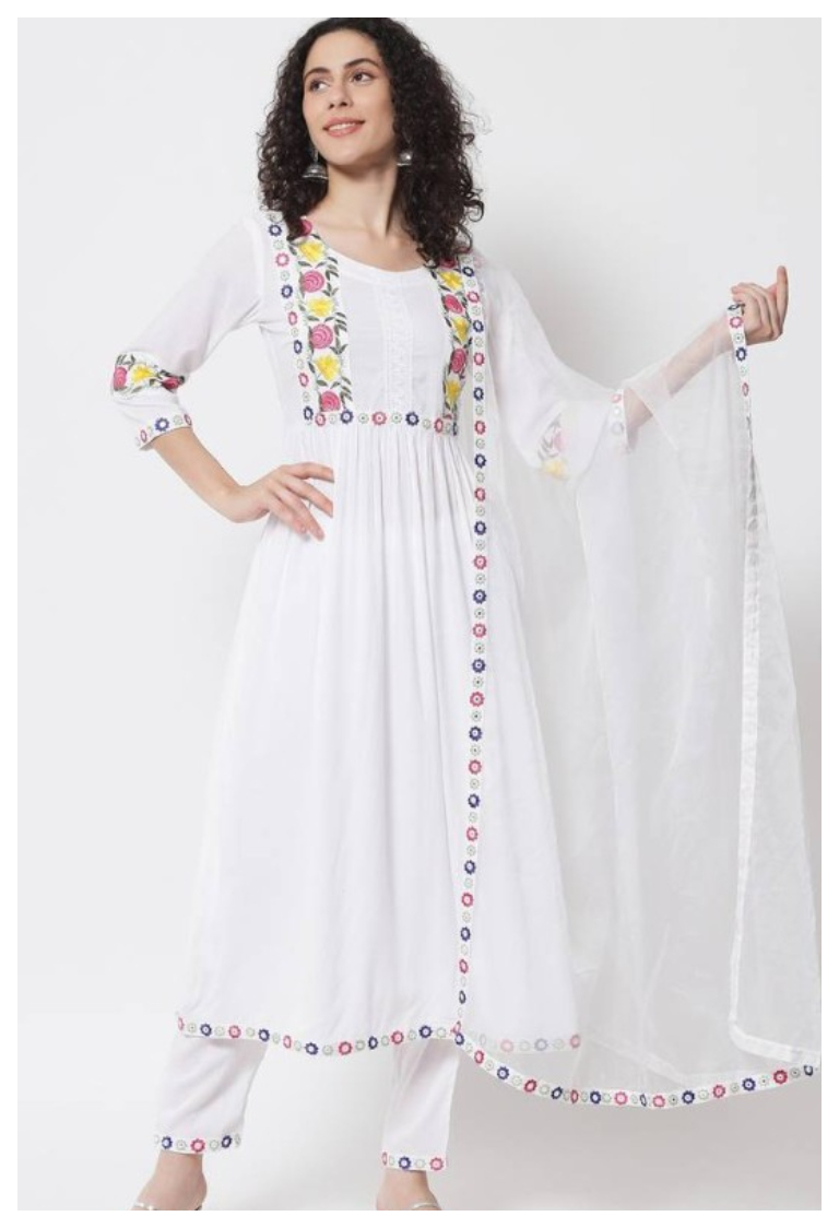 A white Anarkali is something that you can never go wrong with, and it’s the easiest way to embrace the Cloud Dancer trend. Mirraw presents you with this stunning white Anarkali set that has multicolor floral and geometric embroidery on it. The plain white color of the suit truly lets the embroidery shine. Perfect for daily and office wear, this set is for the days when you want to do more with less.