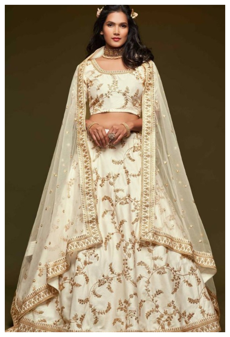 The beauty of Cloud Dancer white is that it pairs well with so many colors especially metallics. This is skillfully demonstrated with Mirraw’s white and gold dori and sequins lehenga. Perfect for the bride who is looking for alternatives to the traditional reds and pinks, this lehenga is understated elegance redefined. Its smooth white fabric is the perfect canvas for the shimmering golden embroidery. Trust us when we say this: once you don this lehenga, you will glow differently.