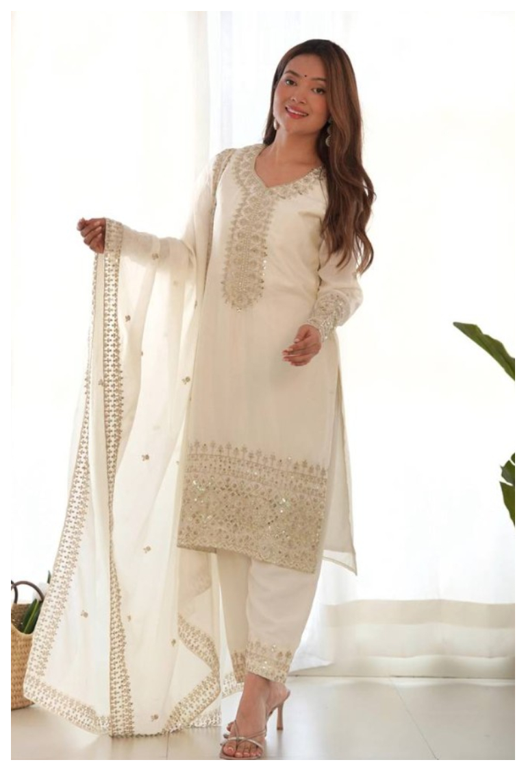Few outfits celebrate the Cloud Dancer white trend like the salwar kameez. Shop for this stunning embroidered salwar kameez from Mirraw and upgrade your style quotient with ease. It is full-sleeved and has a soft V-neckline. The soft, cloud-like color is juxtaposed with graceful silver embroidery, creating a vivid effect that speaks of elegance and minimalism.