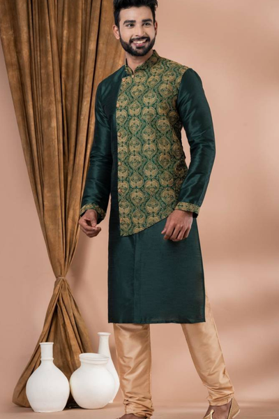 This Dark Green Kurta Set from Mirraw is perfect for festive celebrations. The silk kurta in a rich green shade pairs beautifully with a cream viscose pajama, creating a vibrant yet elegant look. This kurta has an uneven design and features a plain design with motifs. Ideal for Diwali pujas, family gatherings, or festive parties, this kurta set helps you stand out gracefully.