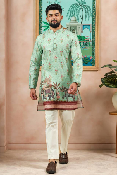Mint green Kurta pajama is perfect for festive and ceremonial occasions. The kurta is made from soft cotton with a designer digital print and delicate embroidery. It comes with elephant motifs on the hem and a beautiful patch design all on the kurta. The full sleeves, a round neck, and a comfortable stitched fit, this kurta pajama set perfect for Diwali parties.