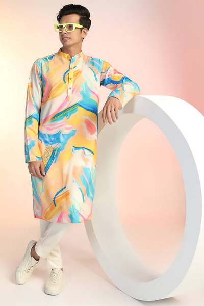 If you are someone who likes to splash colours in their look, then this design is for you. The design of the kurta is very simple. The kurta features a multicoloured pattern all along the kurta design. It also has a simple Chinese collar and full sleeves that make it perfect for Diwali parties.