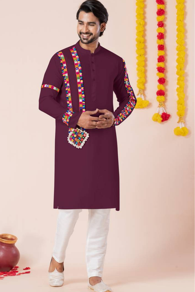 This wine rayon Designer Kurta Pajama is a stunning choice for Diwali celebrations. The kurta is made with soft rayon fabric in wine colour. The design gives off an Indo-Western vibe. It features an embroidered design in multicolours on the sleeves and the kurta as well. This kurta pajama ensures you look stylish and feel at ease, making it a standout piece for the occasion.