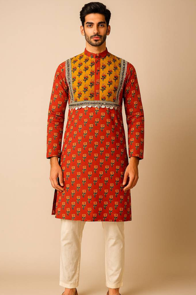 Orange Cotton Kurta Set for Men