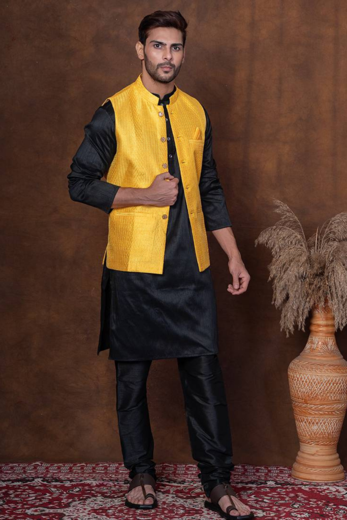 This Black Dupion Kurta Jacket Churidar Set by Mirraw is a sophisticated choice for festive occasions. The kurta is crafted from luxurious Dupion silk that makes it perfect for occasions. The kurta set is in a zed black colour and is complemented with a shiny yellow Nehru jacket. The jacket has a simple design and consists of two pockets and a pocket square.