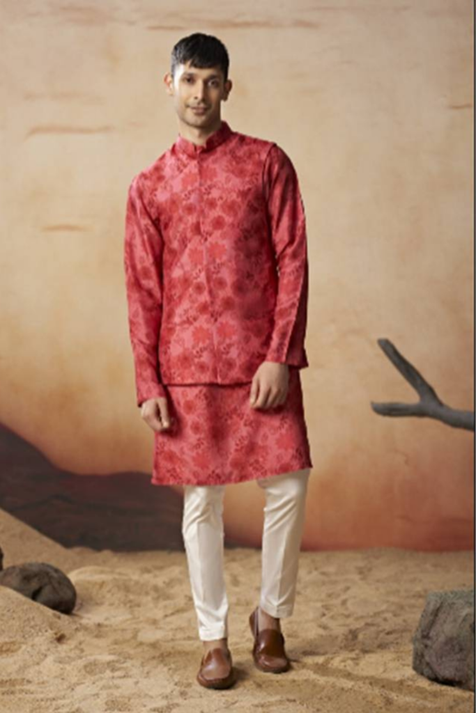 This red floral print Nehru jacket set is a standout choice for festive occasions. The kurta is made from premium Russian silk that contributes to its smooth texture. The jacket features a vibrant red floral print along with a mandarin collar. This ensemble is ideal for weddings, family gatherings, or cultural celebrations.