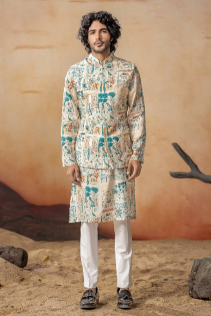 If there is one colour that can never go out of style for festival celebrations is an Ivory white kurta set. The whole kurta set is crafted with soft organic cotton fabric. The kurta and Nehru jacket feature an abstract print in multicolours. The white cotton trousers complete the set with a smooth finish and gentle stretch for effortless movement.