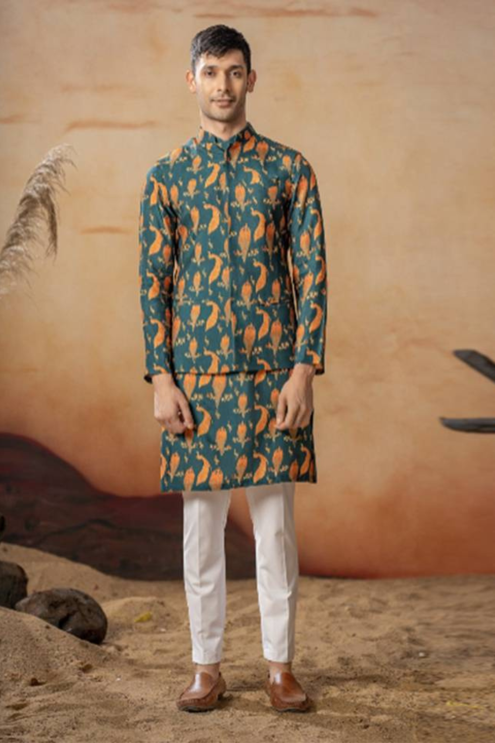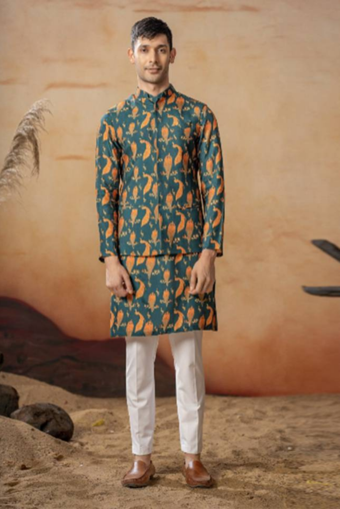 This stylish kurta pajama set is very beautiful and thus is suitable for festive and special occasions. The kurta is in a deep teal shade, decorated with bright orange peacock motifs that give it a lively, festive feel. It features a straight cut with a classic collar, making it look sharp yet comfortable. You must pair it with crisp white churidar pants and brown loafers to enjoy the celebrations.