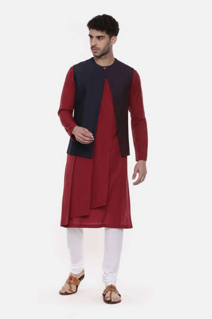 Want that perfect pujo vibe? Go for this black and red kurta jacket set. The design is very simple, and it comes in a three-piece set. It has a Nehru jacket in black colour with a red kurta in Indo-Western style. It comes with a white colour churidar pajama that complements this style. This is an ideal choice to enjoy the pujo festivities. Just wear Kolhapuri chappals and a watch to complete your look.