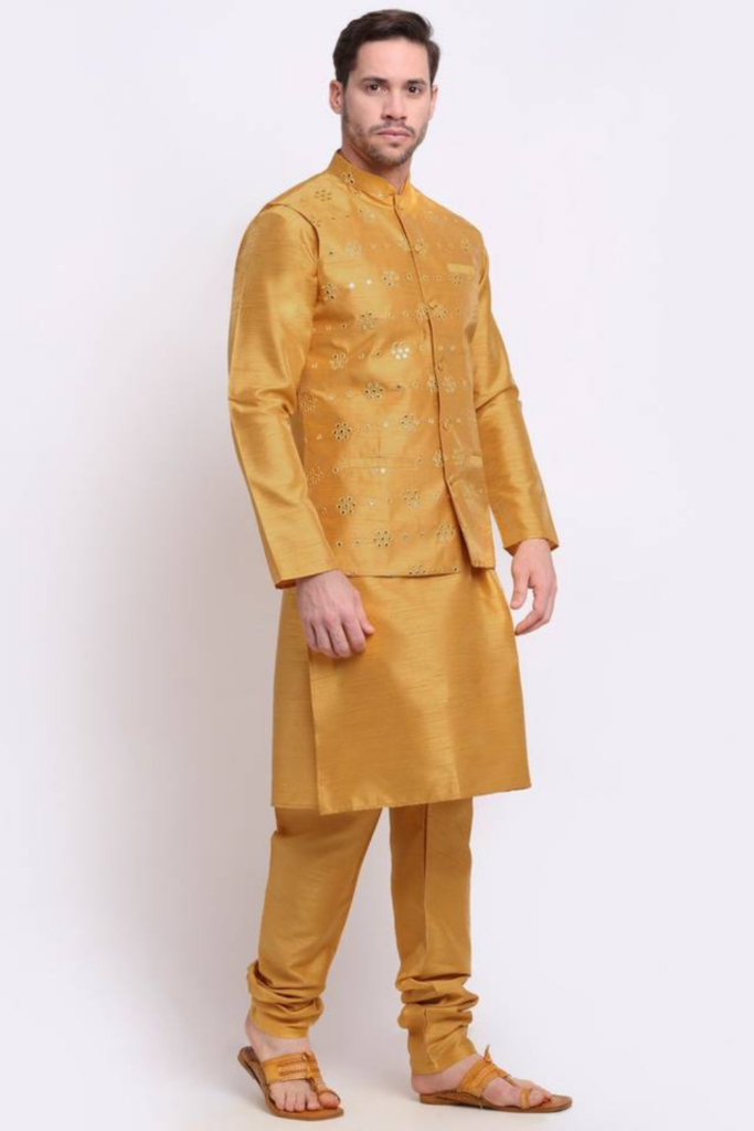 This gold silk kurta set is a graceful choice for weddings and festive evenings. The rich golden silk of the kurta set makes it a great piece for festivals and the wedding season. The matching Nehru jacket comes with beautiful mirror embroidery all along it. The fabric feels smooth and elegant, making it comfortable to wear while looking stylish.