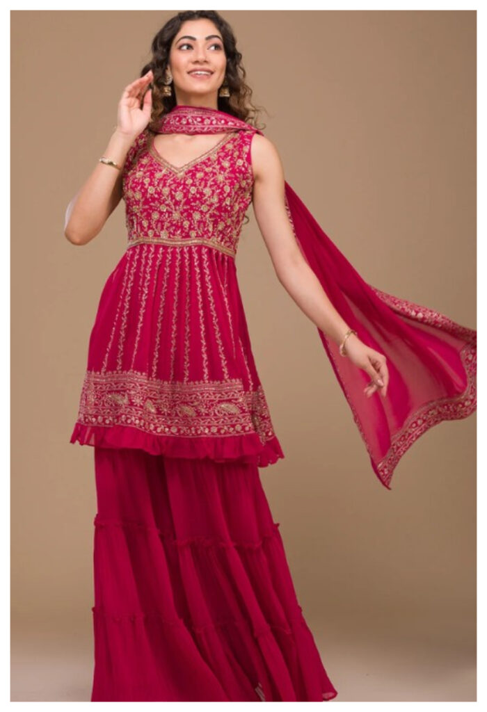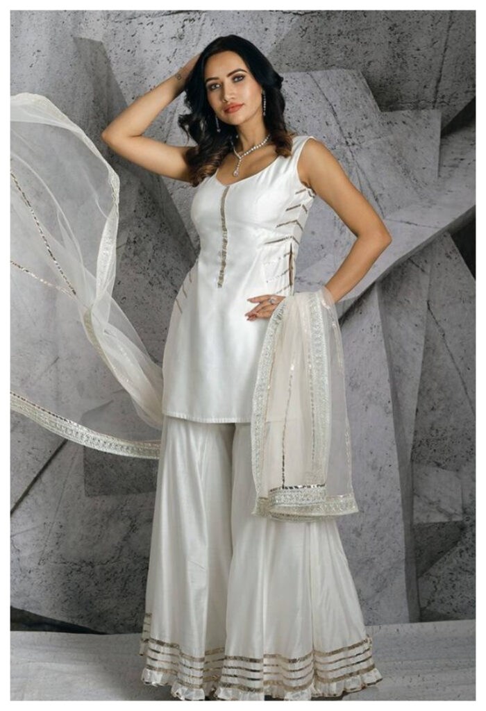 This sharara set is made of satin fabric, giving it a soft, natural shine. The fabric flows smoothly and feels light, making the outfit comfortable for long celebrations. The kurti may feature embossed or foil-printed designs that add texture without adding weight. The sharara pants have a gentle flare that enhances the satin glow. The dupatta is usually sheer, letting the golden tones stand out.
