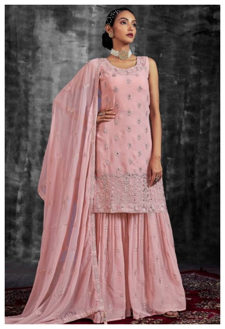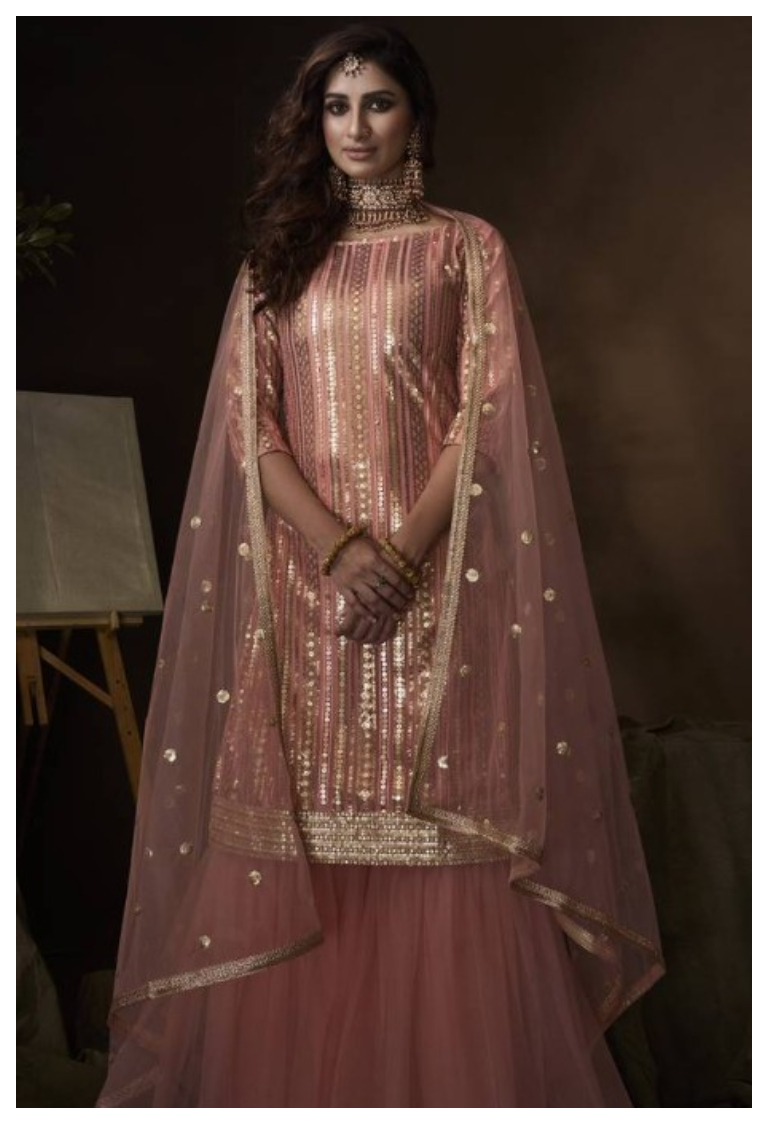 This sequin sharara set is designed for those who want a striking night look. The sharara pants are made from velvet or satin, giving a smooth base. The kurti is the main highlight, covered with sequins that catch light from every angle. The sequins are arranged in neat patterns so the outfit looks stylish. The dupatta is kept simple to balance the shine.