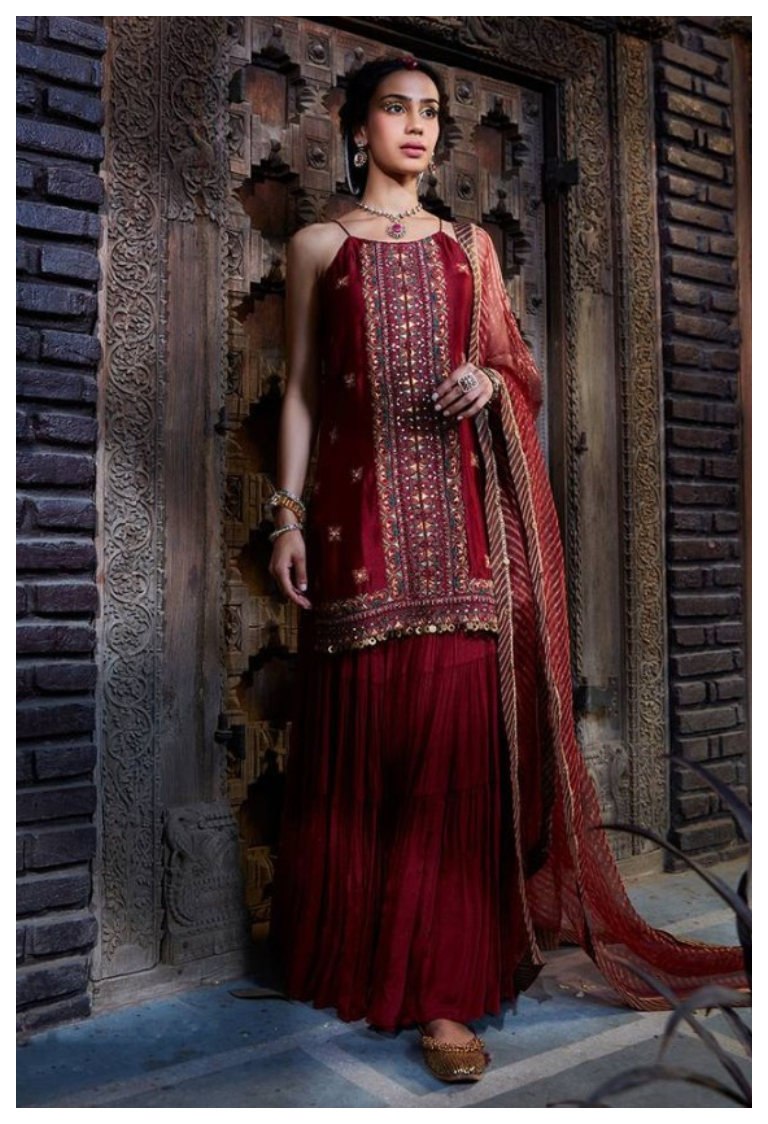 This sharara is perfect for winter weddings. The main focus is the detailed thread embroidery on the kurti, using shades of gold, beige, or maroon to create floral or geometric patterns. The sharara pants are plain velvet, allowing the embroidered kurti to stand out. The dupatta carries small embroidered motifs that tie the whole set together. The threadwork makes this outfit great for someone who prefers classic, detailed designs over sequins or mirror work.