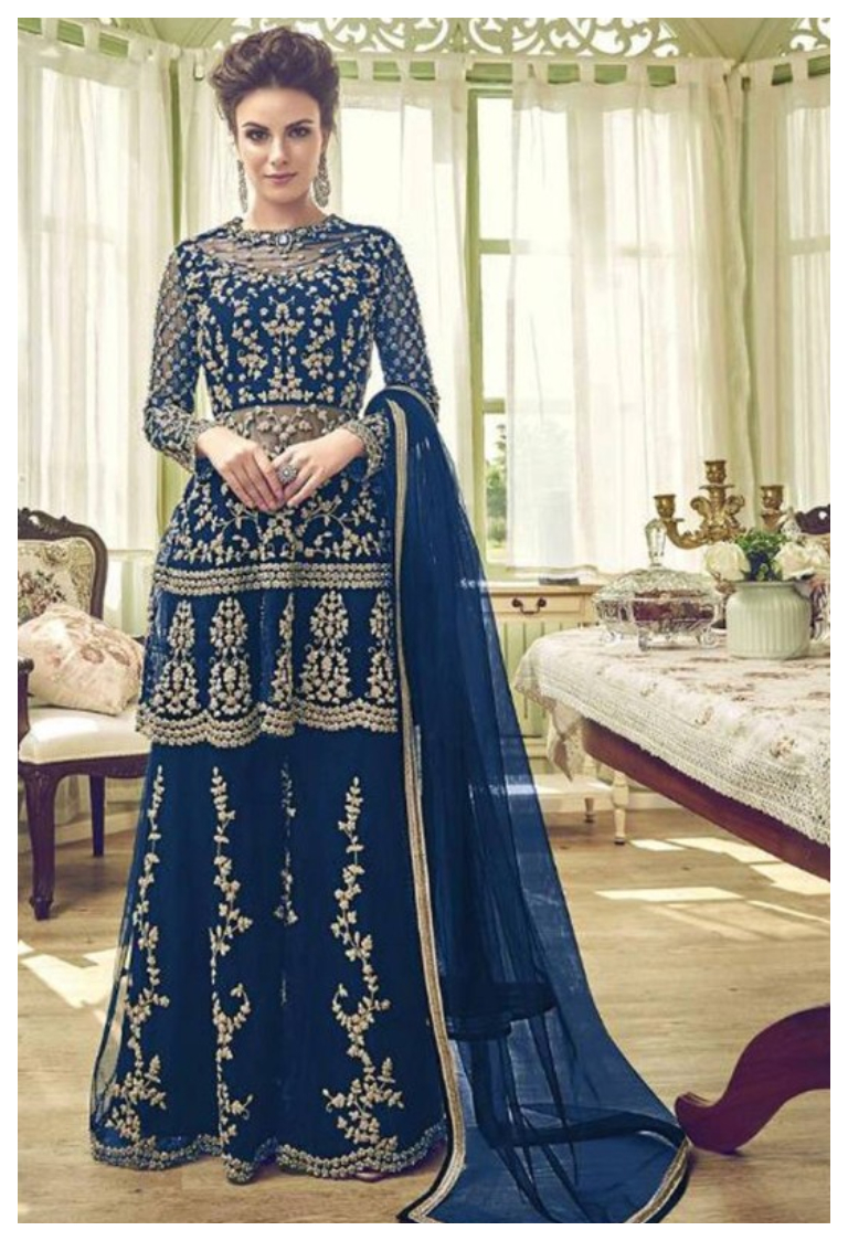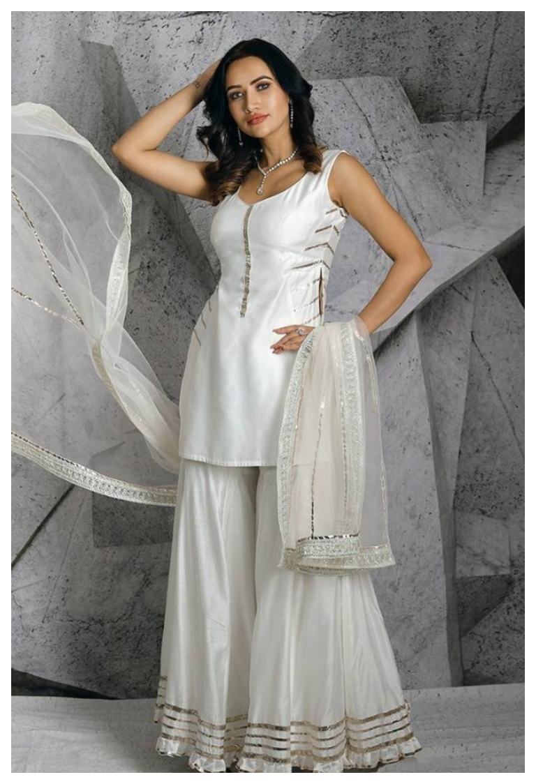 This sharara set is made of satin fabric, giving it a soft, natural shine. The fabric flows smoothly and feels light, making the outfit comfortable for long celebrations. The kurti may feature embossed or foil-printed designs that add texture without adding weight. The sharara pants have a gentle flare that enhances the satin glow. The dupatta is usually sheer, letting the golden tones stand out.