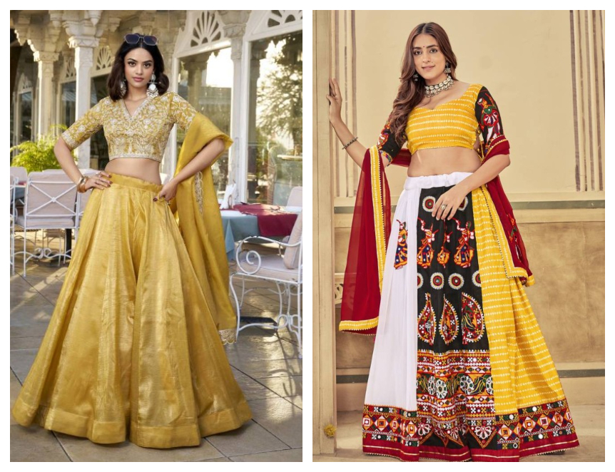 - Haldi: Haldi calls for lightweight lehengas that are easy to move in. Go for georgette or chiffon haldi lehengas that exude glamor while ensuring ease of movement.
