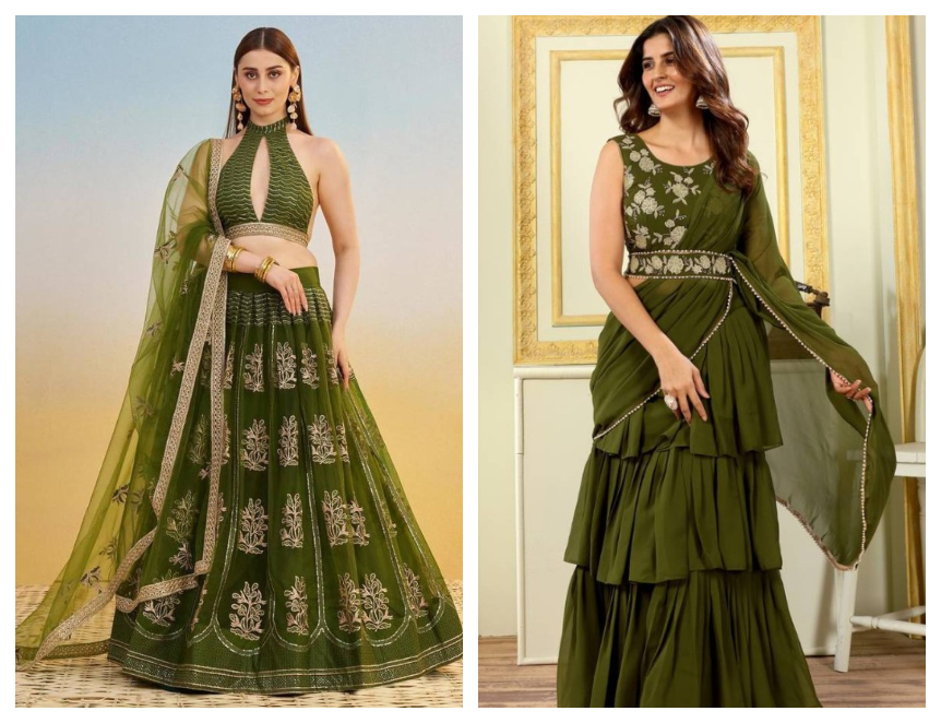 - Saree lehenga: This unique garment beautifully merges two iconic pieces together โ the saree and the lehenga. Easy to carry and versatile, the saree lehenga also creates opportunities for experimenting with draping styles.
