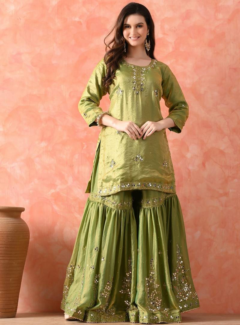 Mirror work shararas are trending in 2026 for festive and wedding wear. The embroidery looks beautiful when paired with pearl or stone work. These shararas work beautifully for sangeet nights, mehendi, and evening parties.