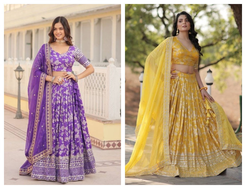 Chiffon is soft, delicate, and almost weightless. It gives a very calm, graceful look and never feels overpowering. Many people pick chiffon lehengas for daytime events or summer weddings because they stay cool and are easy on the body, especially when you want something simple but elegant.