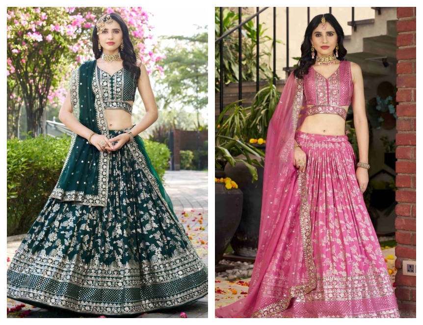 This fabric stands out because the design is woven into the fabric itself. Even without heavy work, it looks rich and detailed. Jacquard lehengas are popular for weddings and festive occasions where you want something traditional that feels elegant without too much embellishment.