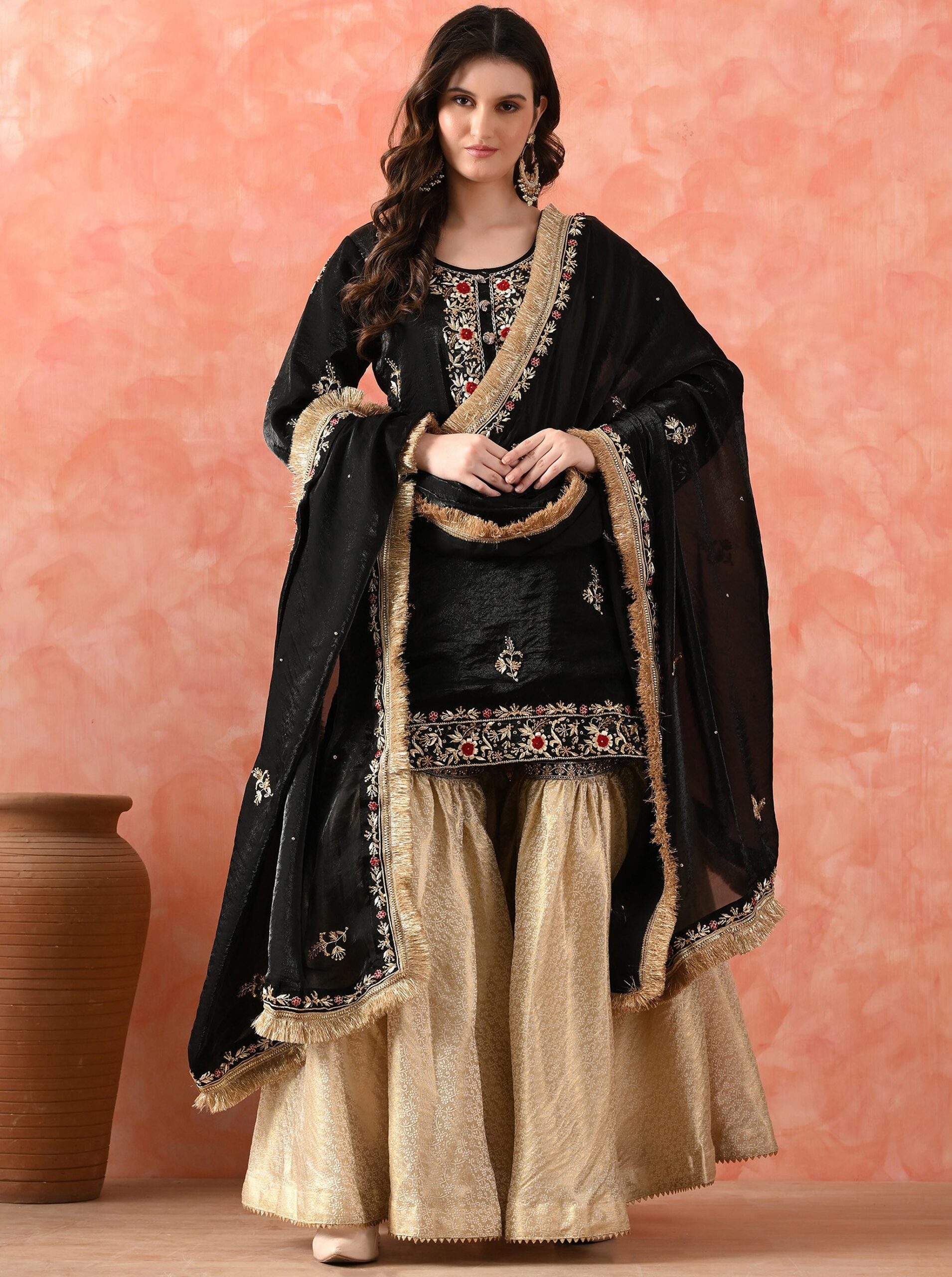 If heavy lehengas aren’t your vibe, you could always go for a decadent Sharara instead. They provide the same drama that comes with a lehenga but are much more comfortable. These days, the modern woman is replacing her classic lehengas with comfortable Shararas. The structure of the Sharara is mesmerising, with it being fitted till the knees and then dramatically flaring down towards the bottom. Most Shararas are crafted from lightweight fabrics, which makes them easy to carry through long hours of the festivities. Also, unlike Churidars or tightly fitted lehenga skirts, its signature wide leg cut allows easy walking and dancing. Its silhouette is also airy, making it perfect for long celebrations. Shararas are also a prominent pick over the Anarkali because it distributes visual weight better than it. They come with a short kurti and high-waisted flared pants that break the visual line of the body at the waist rather than the bust. This beautiful ensemble is particularly the perfect choice for weddings, long celebrations and movement-heavy events such as the sangeet.