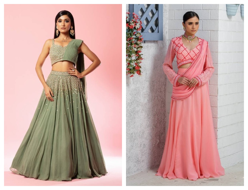 One-shoulder trail is the drape where the dupatta is pinned on one shoulder and is left completely loose at the back. It creates a long flowing trail which looks mesmerizing and gives you a dreamy feeling. The front of the lehenga for women remains neat, which makes the space for the blouse and jewelry to stand out.