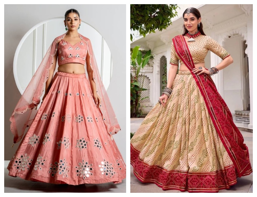The chaniya choli looks like a lehenga – these outfits are very colorful and frequently adorned during the Navratri festival. Gujarat lehengas are feature mirror work, thread embroidery, and vibrant prints. The skirts are wide and full, which allows women to move and dance. The designs frequently contain flowers and geometric motifs. These lehengas are joyous and energizing.