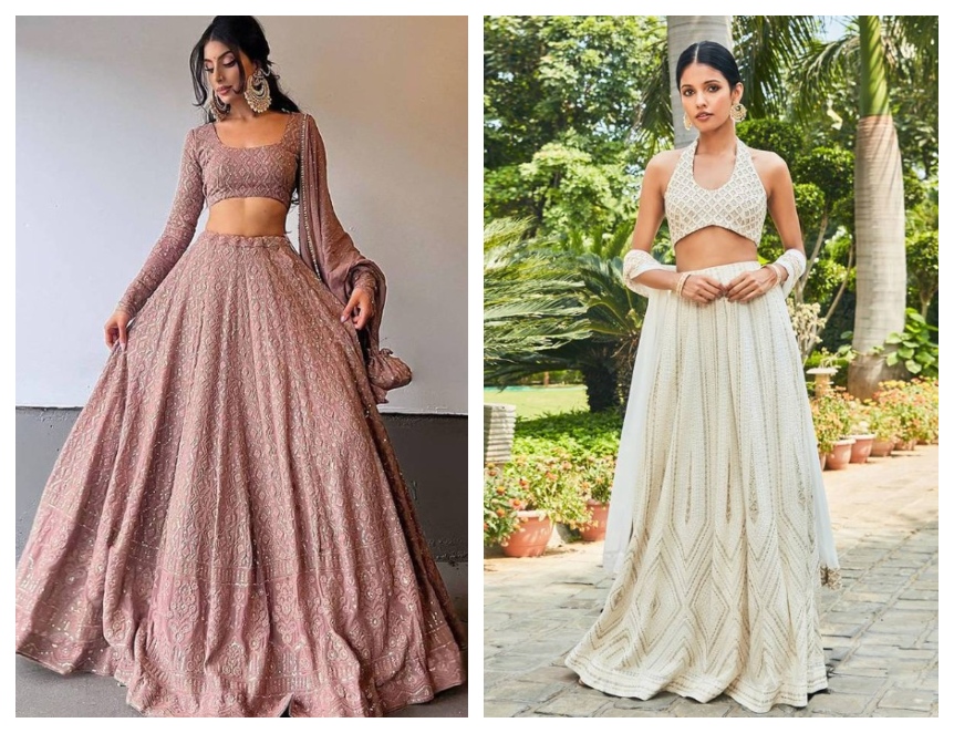 Chikan is the specialty of Lucknow in Uttar Pradesh. Chikankari is a technique in which white thread is embroidered onto soft, muslin-like fabric such as muslin, chanderi and silk. It’s very tiny, and it’s so neat and these lehengas appear soft and subtle. Chikankari lehengas are a hit among brides during day weddings and functions. There are many varieties of stitches in chikankari all of which lend an exquisite look to it.