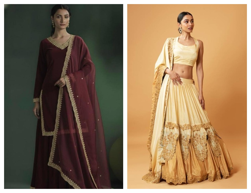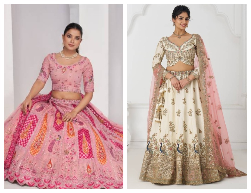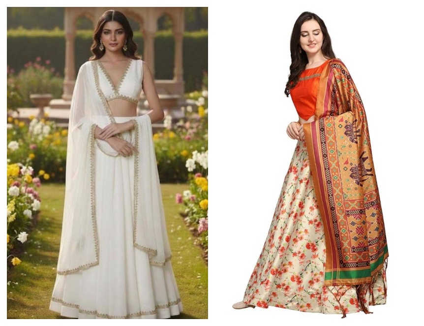Madhubani painting is a traditional art form of Bihar. A few lehenga choli designs use prints and patterns derived from these folk paintings. The colors can alternate between earthy and intense. The designs narrate stories of village life and nature. These are artistic lehengas and they seem closer to the regional culture. They are a means of continuing folk art on modern clothes.