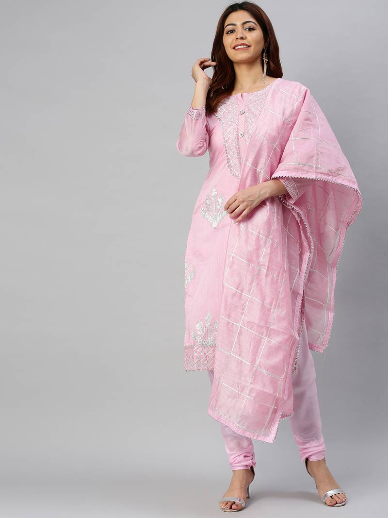 If you want to go for a sleek and formal look, then a Churidar suit should be your pick. The fitted bottoms follow the natural line of the legs and then taper down to form delicate gathers at the ankles.ย