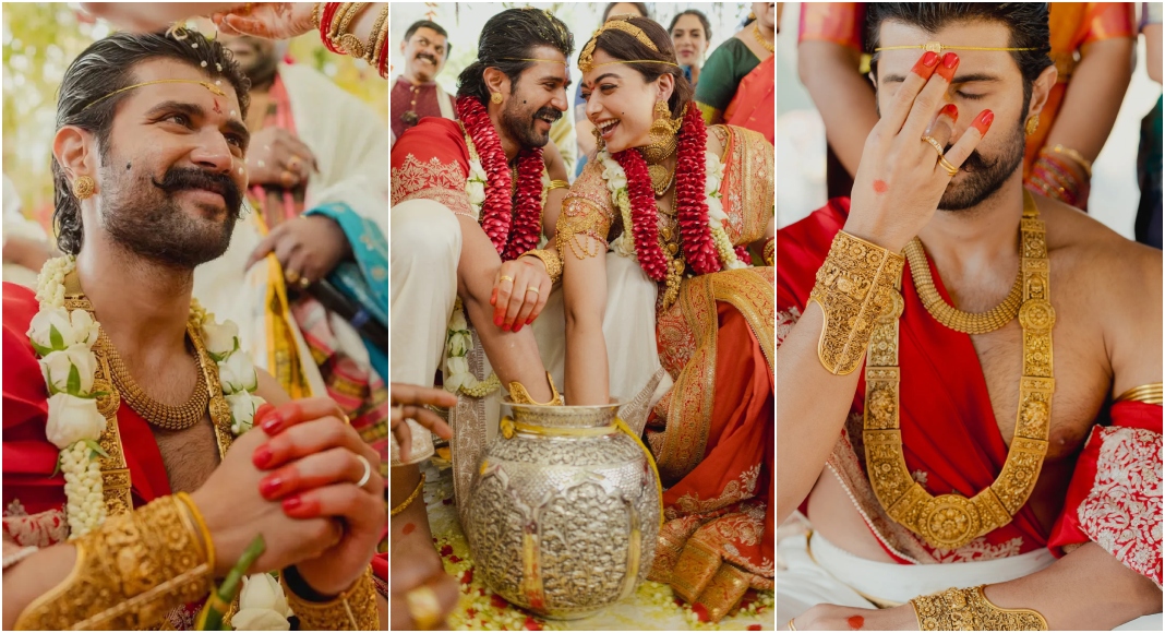 Rashmika Mandanna and Vijay Deverakonda tied the knot in Udaipur on Feb 26 and set the entire internet on fire. Their South Indian wedding with its red and gold palette, temple jewelry, and traditional attire was a refreshing break from the monotonous pastel tones of Bollywood. However, what got people talking the most was their jewelry look. As expected, Rashmika adorned temple jewelry like a goddess. But what stole the spotlight was Vijay’s jewelry look. The groom embraced maximalism and went all out with his jewelry. From layered necklaces to solid kadas, he donned them all. In this blog, let’s decode Vijay Deverakonda’s wedding look and get to know what made it so special.