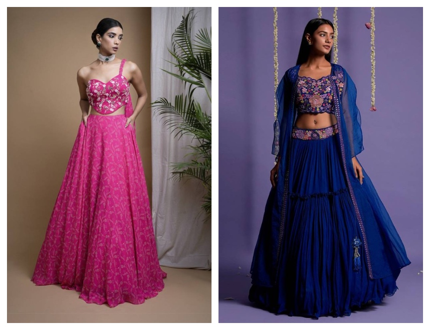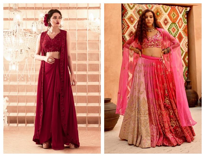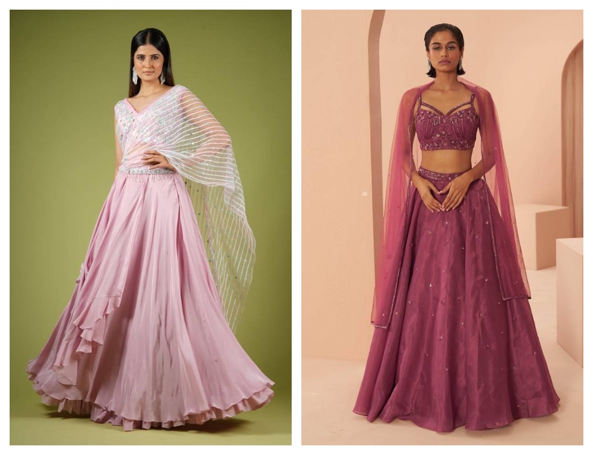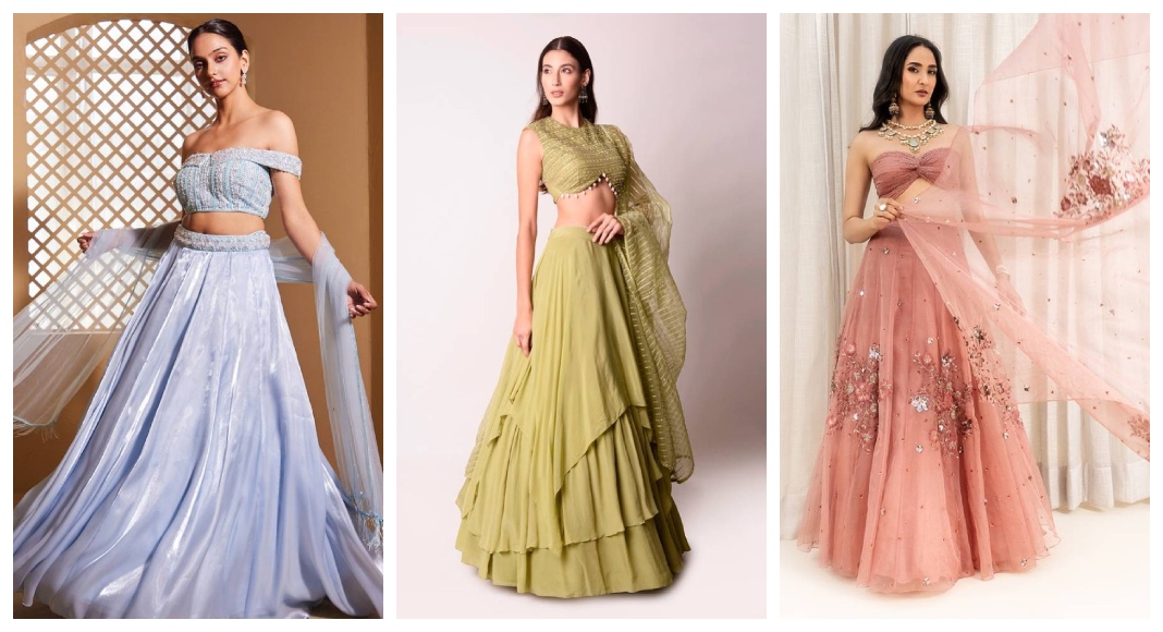In these lehengas, the three-piece set of a skirt, choli, and dupatta remains the same, but designers are now experimenting with crop-top blouses, off-the-shoulder necklines, cape dupattas, and structured corset cholis. This serves to add a stylish, modern look to the age-old silhouette. Traditional embroidery techniques such as zardozi, zari, and mirror work are being imagined in new and innovative ways. Thus, party lehengas are truly the perfect balance of tradition and modern glamor.