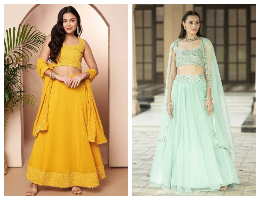 Party lehengas come in a plethora of designs. You can explore traditional A-Line lehengas and circular lehengas. Or you can go for a stylish mermaid lehenga. If you want a contemporary touch, jacket-style and cape-style lehengas are your pick. However, if you want to keep things traditional, then opt for a Kali-style lehenga. Thus, there is a party lehenga set for every mood and moment.
