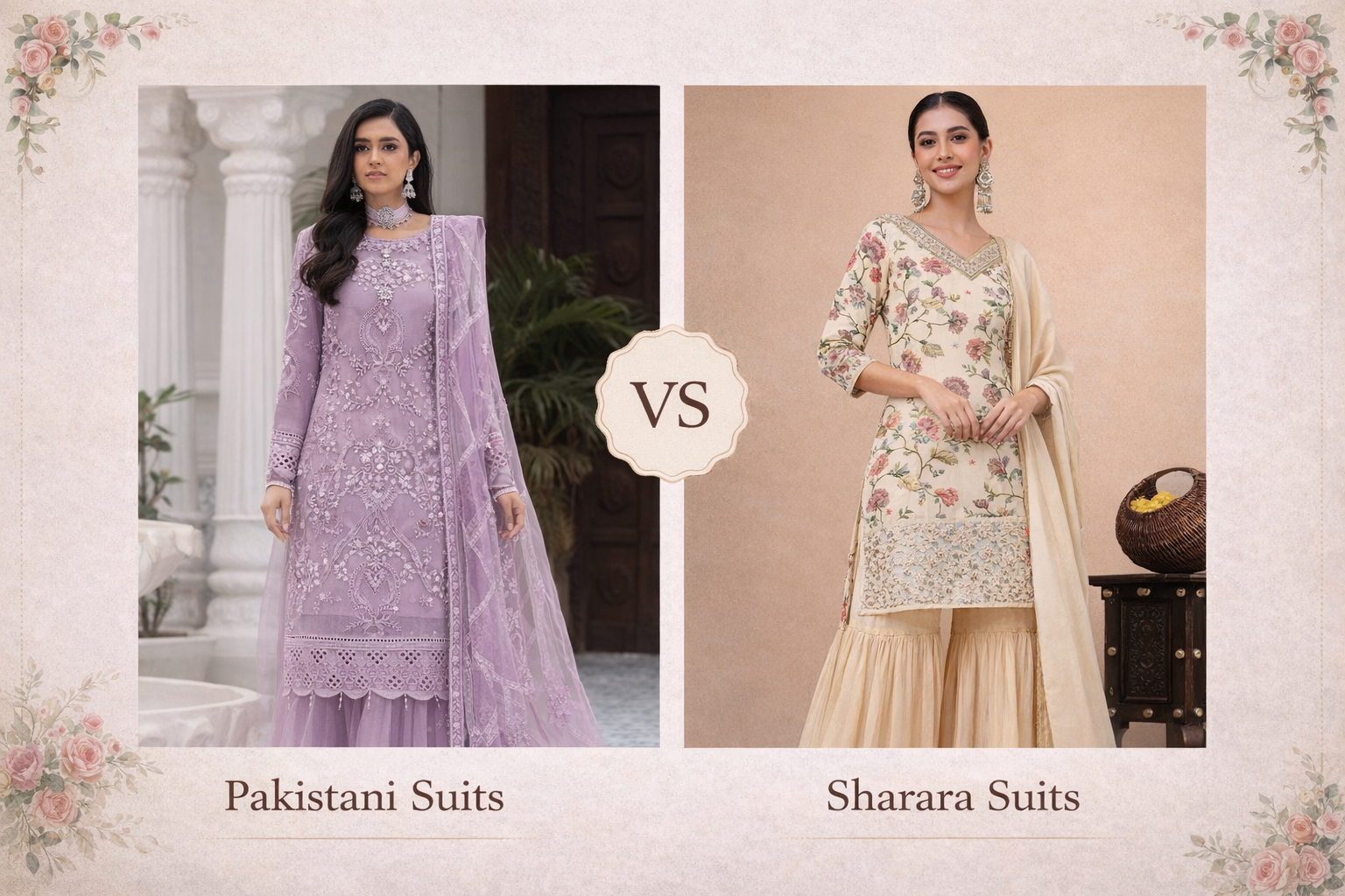 When choosing the perfect festive outfits, the Pakistani suit and the Sharara suit offer two very distinct yet equally captivating styles. Pakistani suits are known for their clean lines and structured elegance. On the other side, Sharara suits steal the show with their dramatic flair and festive ready appearance. From intimate occasions to grand celebrations, both these styles have their charm. Pakistani suits give off a polished appearance, while the Sharara brings the drama. Understanding the core differences between the two will help you make an informed decision, based on the occasion, style, and vibe that you want to exude.Â