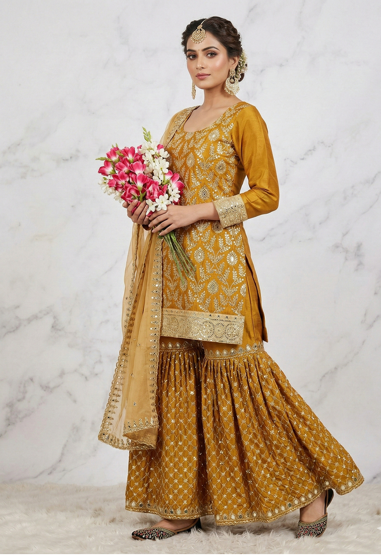 Sharara is defined by its dramatic visual effect and festive glamour. These suits are fitted to the knee and then flare dramatically towards the floor, creating an extremely elegant appearance. Often paired with short kurtas for a chic look, this ensemble is designed to bring movement and drama to your look. The magical thing about the sharara dress is its strong association with festive wear. They are often crafted with rich fabrics like silk, velvet, and georgette. The sharara suits are also bedecked with zari, sequins or gota patti work, leaning in heavily into the festive wear vibe.