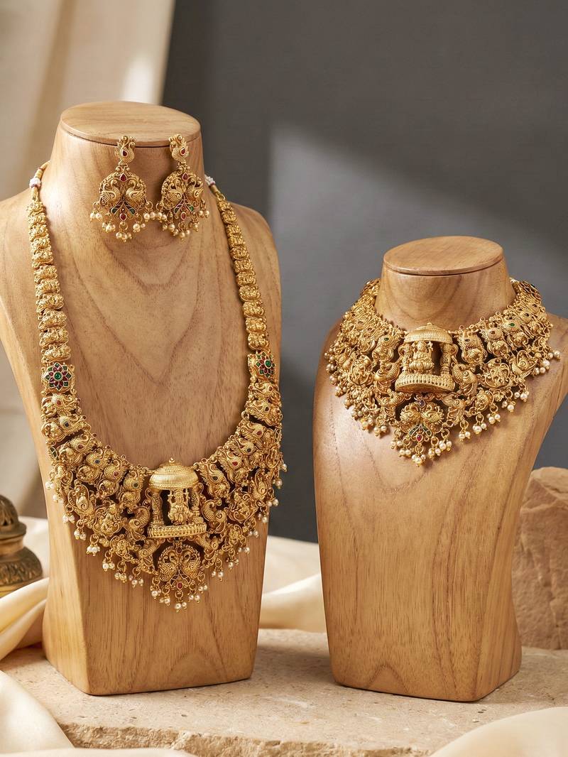 - Temple Jewelry Sets: These are a beloved choice of every South Indian bride. They feature beautiful temple and deity motifs, which make them an absolute heritage piece.